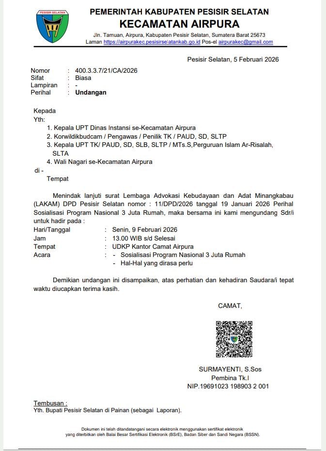 Painan: Sumaryenti,S.Sos Camat Airpura mengundang Ketua DPD LAKAM Pesisir Selatan dr H Misri Hasanto,SH.,M.Kes sebagai Narasumber Program Nasional tiga juta rumah. Hal ini terungkap berdasarkan suratnya tanggal 5 Februari 2026.