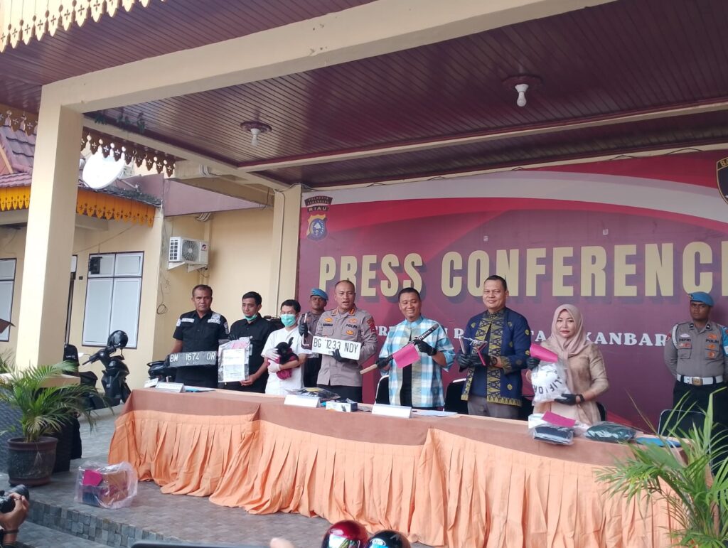 Pekanbaru: Kepolisian Resort Kota (Polresta) Pekanbaru menggelar acara Konferensi Pers hasil pengungkapan beberapa kasus kriminal di kota Pekanbaru. Mulai dari kasus Pencurian kendaraan bermotor (Curanmor), Geng motor, Perdagangan satwa/hewan yang dilindungi, Pencurian dengan kekerasan (Curas), Pencurian dengan pemberatan (Curat) hingga kasus Pengrusakan fasilitas umum (Vandalisme).