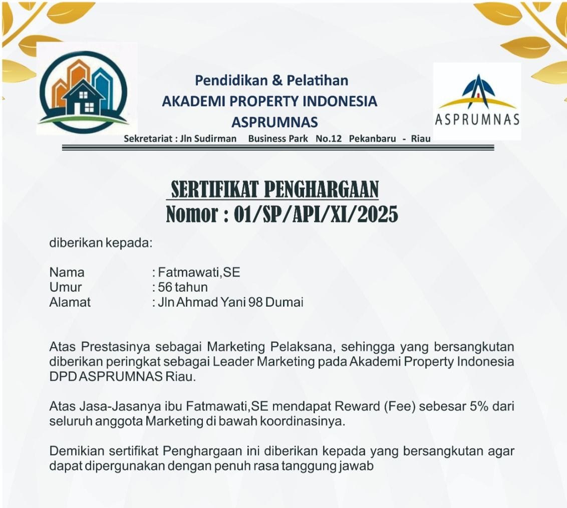 Berdasarkan prestasi di atas, maka Akademi Property Indonesia DPD ASPRUMNAS Riau menetapkan ibu Fatmawati,SE sebagai Leader Marketing Akademi Property Indonesia. Hal ini tertuang dalam sertifikat penghargaan Nomor : 01/SP/API/XI/2025 tanggal 5 November 2025.