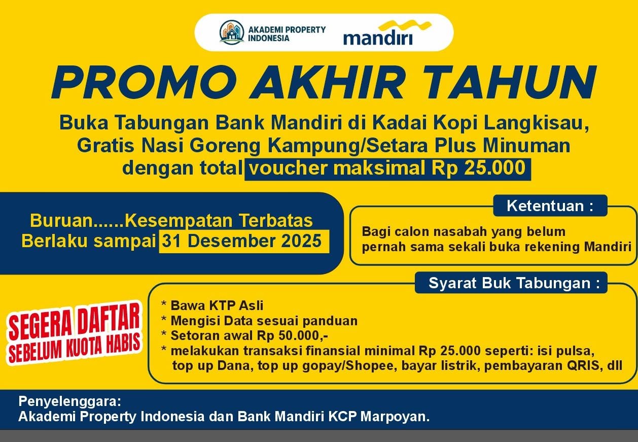 Tujuan promo akhir tahun ini adalah agar masyarakat bisa menerima manfaat mulai dari menabung, dan transaksi kebutuhan sehari hari melalui Rekening tabungan Bank Mandiri. Baik keperluan pribadi, transaksi bisnis (UMKM), dan pembelian secara elektronik. Besok Senin (24/11/2025) akan kita Launching di Kadai Kopi Langkisau Jln Sudirman Ujung, Sudirman Business Park No.12, ujar Herly.