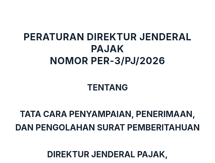 Ketentuan itu termuat dalam Peraturan Direktur Jenderal Pajak Nomor PER-3/PJ/2026 tentang Tata Cara Penyampaian, Penerimaan, dan Pengolahan Surat Pemberitahuan yang ditetapkan dan diberlakukan Dirjen Pajak Bimo Wijayano sejak 16 Maret 2026.